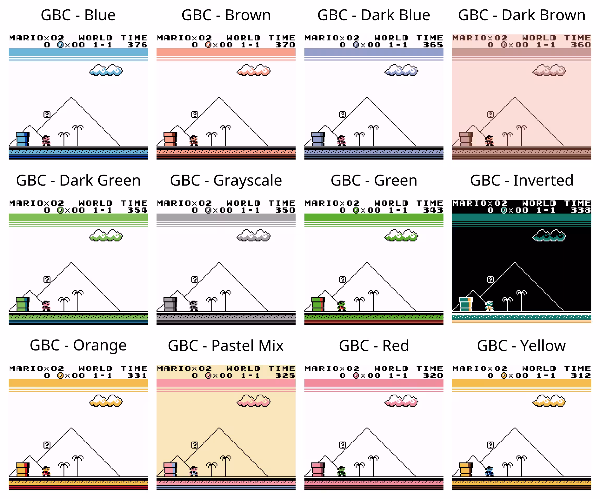 Strictly speaking, there are some games that don't use one of the 12 default palettes, they have their own baked in (and actually Pokemon Red and Blue are two of them). Still, it was always mind blowing to show your friends how to play DMG games with a completely new color scheme they'd never seen before.