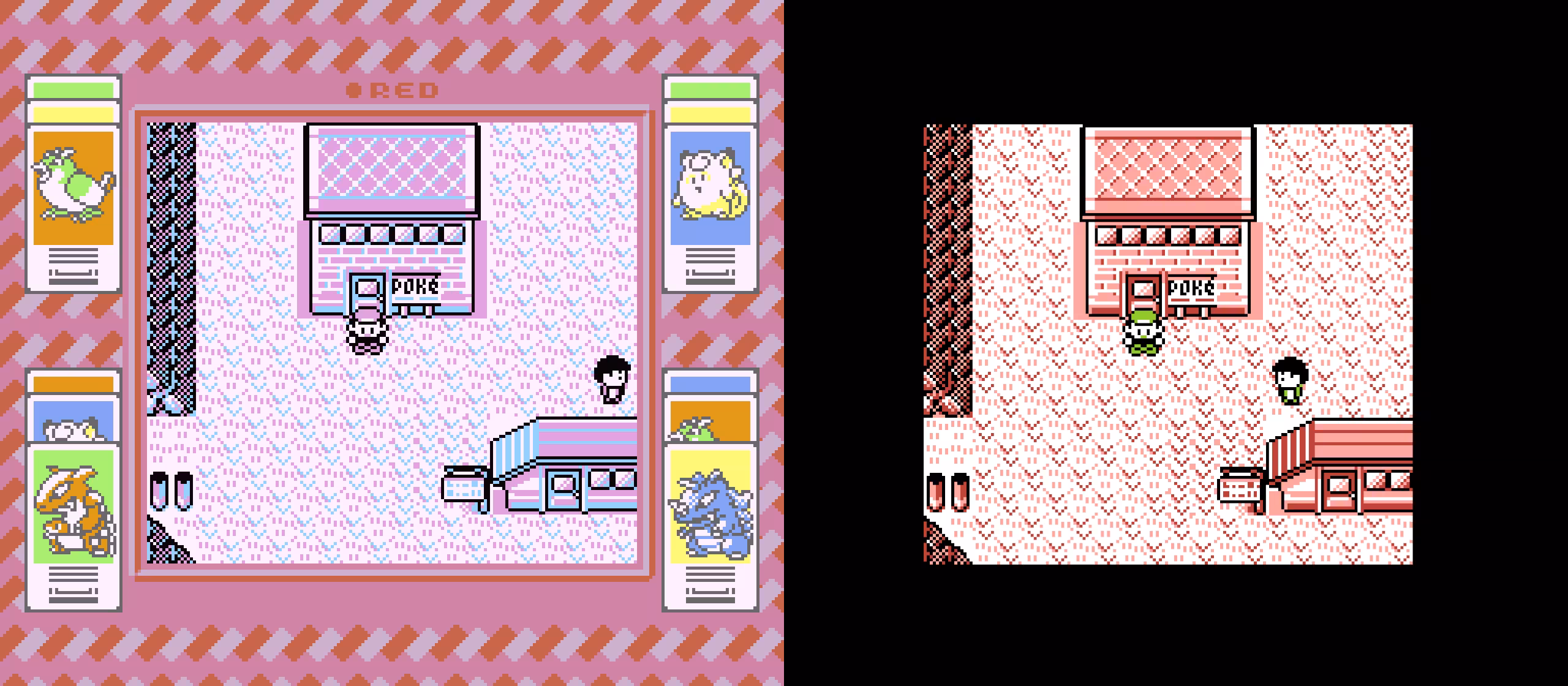 "But wait", I hear you say, "I played Pokemon on a Game Boy Color. I vividly remember there being color!". You're not alone, growing up, I only had a Game Boy Color unit, and so all of my early Pokemon Red experience was seeing it on that device. However, what we both remember was not the specialized color that the SGB provided, but the default effect that the Game Boy Color would apply to all DMG games. Nintendo wanted to show off their fancy new color device, so playing grayscale Game Boy games in grayscale seemed like a bit of a waste. Instead, a GBC would apply the same trick the SGB did and map the grayscale palette to a color one. The difference between the two then, is that on a GBC this palette remains exactly the same for the entire game. By default, this converts the background into shades of red while the sprites get shades of green. A SGB would set these palettes to the developer's choosing, and switch them if desired, but the GBC was stuck with a fixed set.