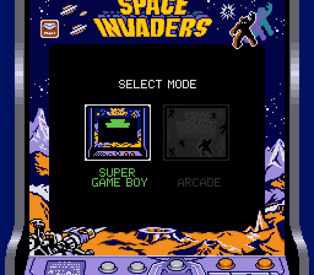 Where things get interesting though, is if you decide to play it on your Super Game Boy. Typically, the game just boots up in the same fashion as it would on a Game Boy, just with color and a border. However, Space Invaders instead greets you with a new option.