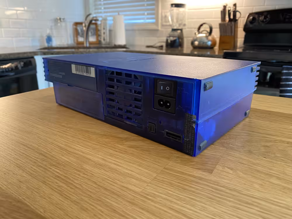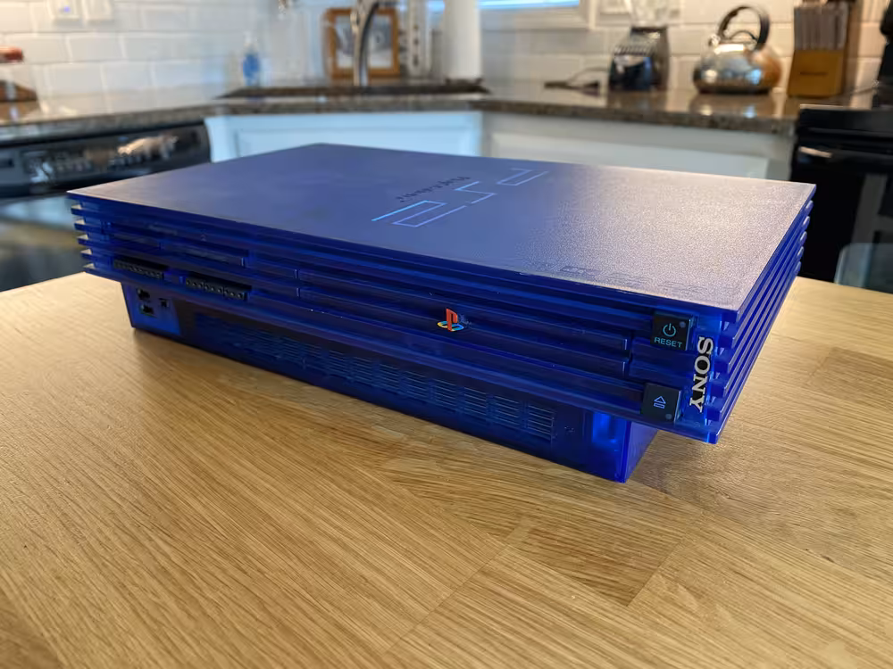 However, for me there's something about having the physical system that I just find rewarding. Warts and all, I enjoy interacting with the actual, original hardware. I enjoy creating an optimized set up for all of my devices. Perhaps most of all, I also enjoy translucent colored plastics. Therefore, when I discovered that Sony produced a Japanese-only version of the PS2 which game in a translucent blue shell, I prowled the internet auction sites until one finally came my way.