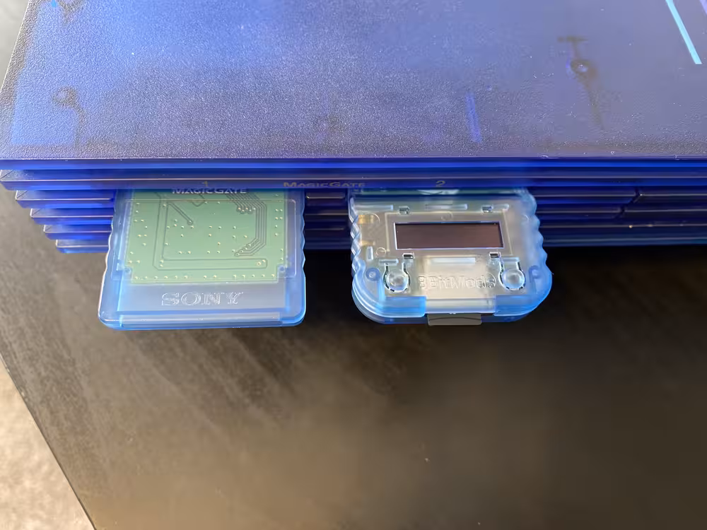 ...Or so the traditional wisdom would tell you. PS2 memory cards are still readily available, and getting a hacked one is surprisingly inexpensive. However, it dawned on me that for a few bucks more, I could instead pick up an accessory that would be much more versatile — an 8BitMods MemCard Pro. If you read my Ultimate GameCube post, you'll know I already had the GC equivalent of this device. It essentially allows you use to a typical micro SD card for storing game save data. Even modest micro SD cards these days are thousands of times larger than typical PS2 memory cards, which range around a few megabytes. It also allow you to back up your saves to a PC, either for safekeeping or to transfer play to an emulator.